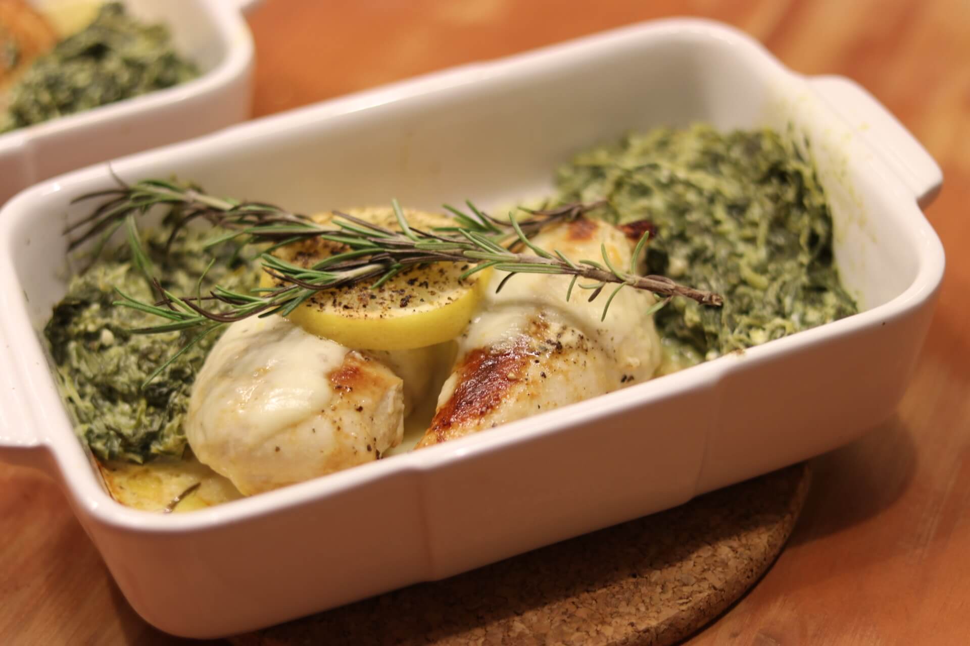 Sobald die 15 Minuten um sind, holt ihr die Auflaufform mit dem Hähnchen aus dem Ofen, garniert es mit dem Spinat und lasst es euch nun ordentlich schmecken.